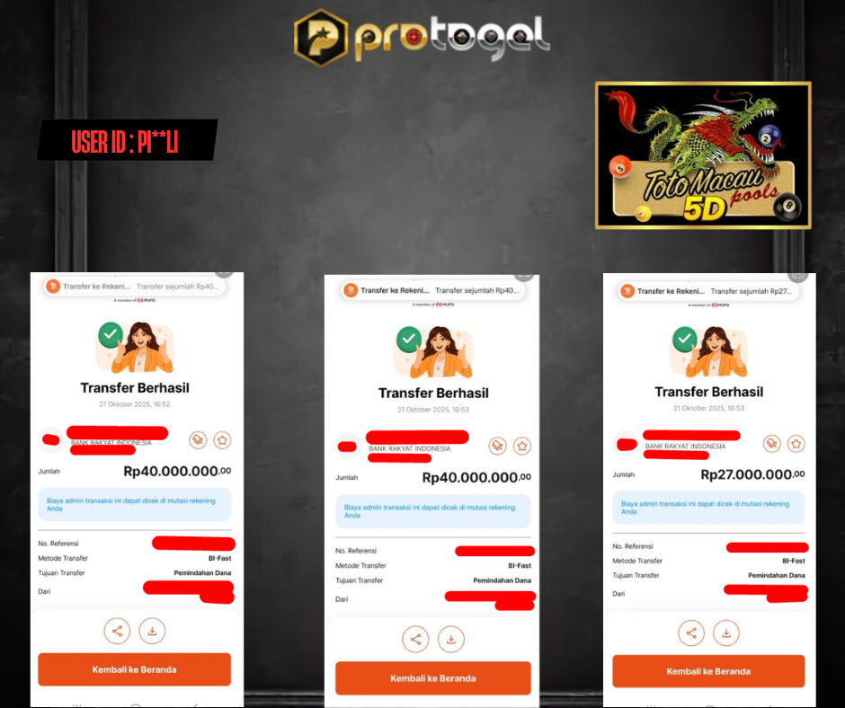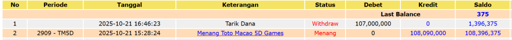 Selamat kepada user : pi**li Telah berhasil mendapatkan hadiah Jackpot pada Permainan Toto Macau 5D Sebesar Rp.108,090,000,- dan melakukan withdraw Rp.107,000,000,- Hanya di PROTOGEL